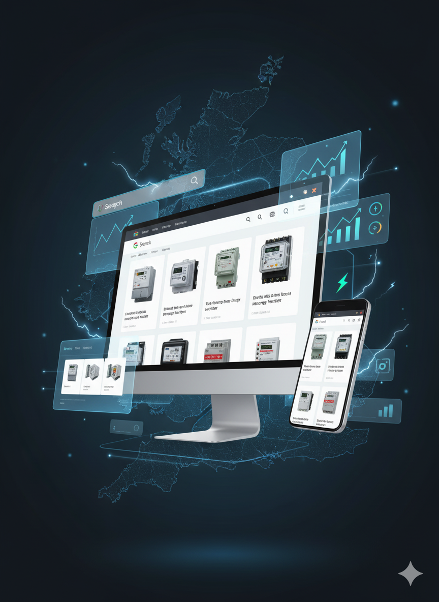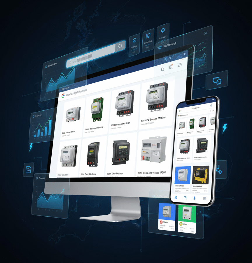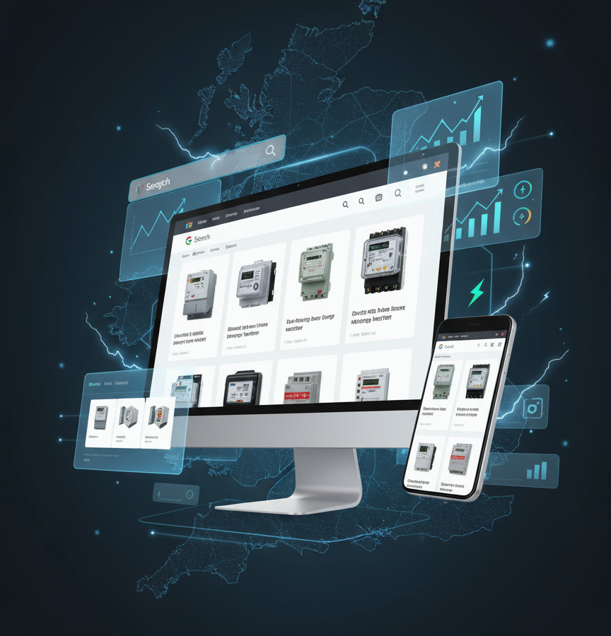• Landing/message match: Ad-to-page alignment by meter type (single/three-phase, CT-operated, DIN-rail, MID), trust badges, clear specs, fast PDPs.