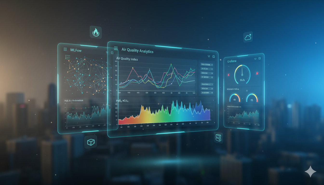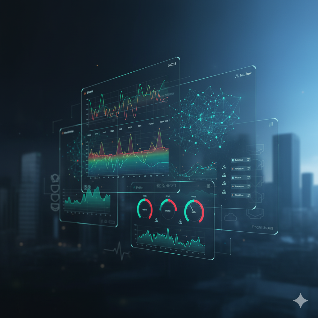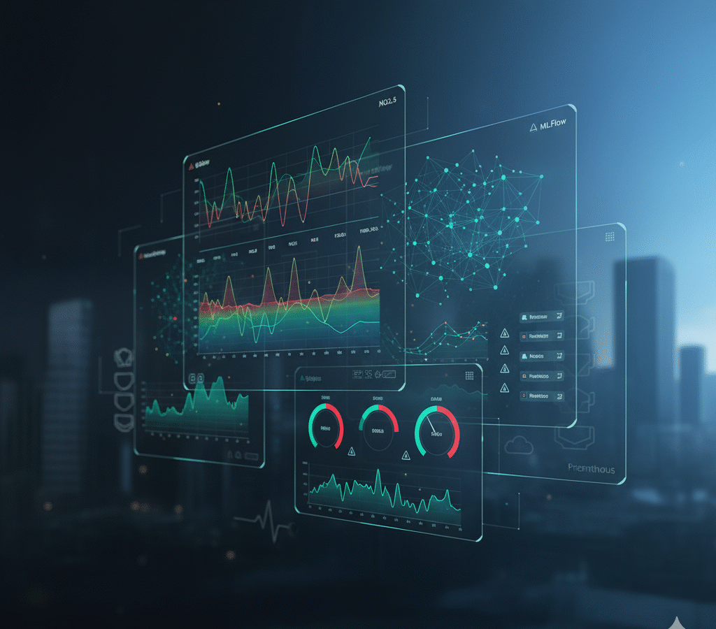 A real-time platform that ingests air-quality data from sensors/APIs, tracks ML experiments with MLflow, and visualizes key pollution metrics in Grafana via Prometheus. Predictive models trained on historical data forecast alert conditions, with automated retraining and Dockerized jobs running in a secure cloud environment. These platforms often offer features such: