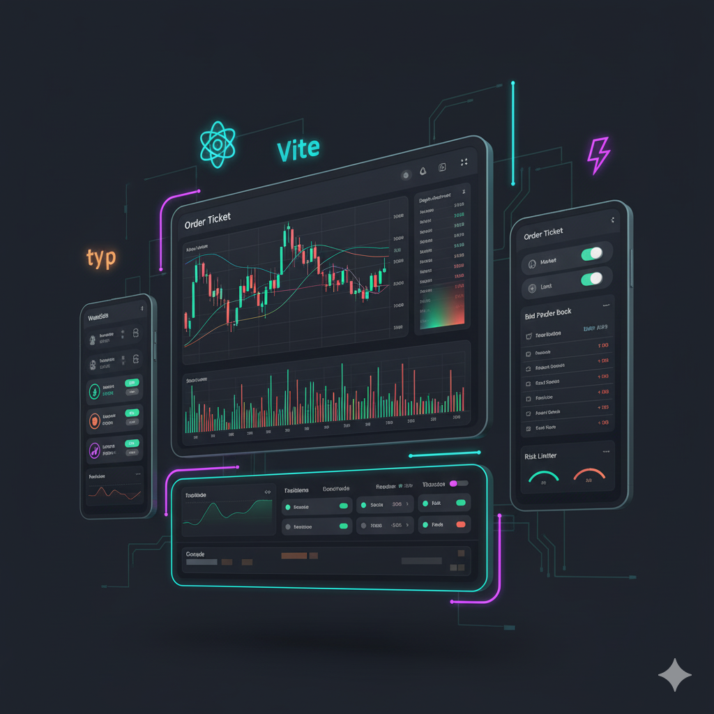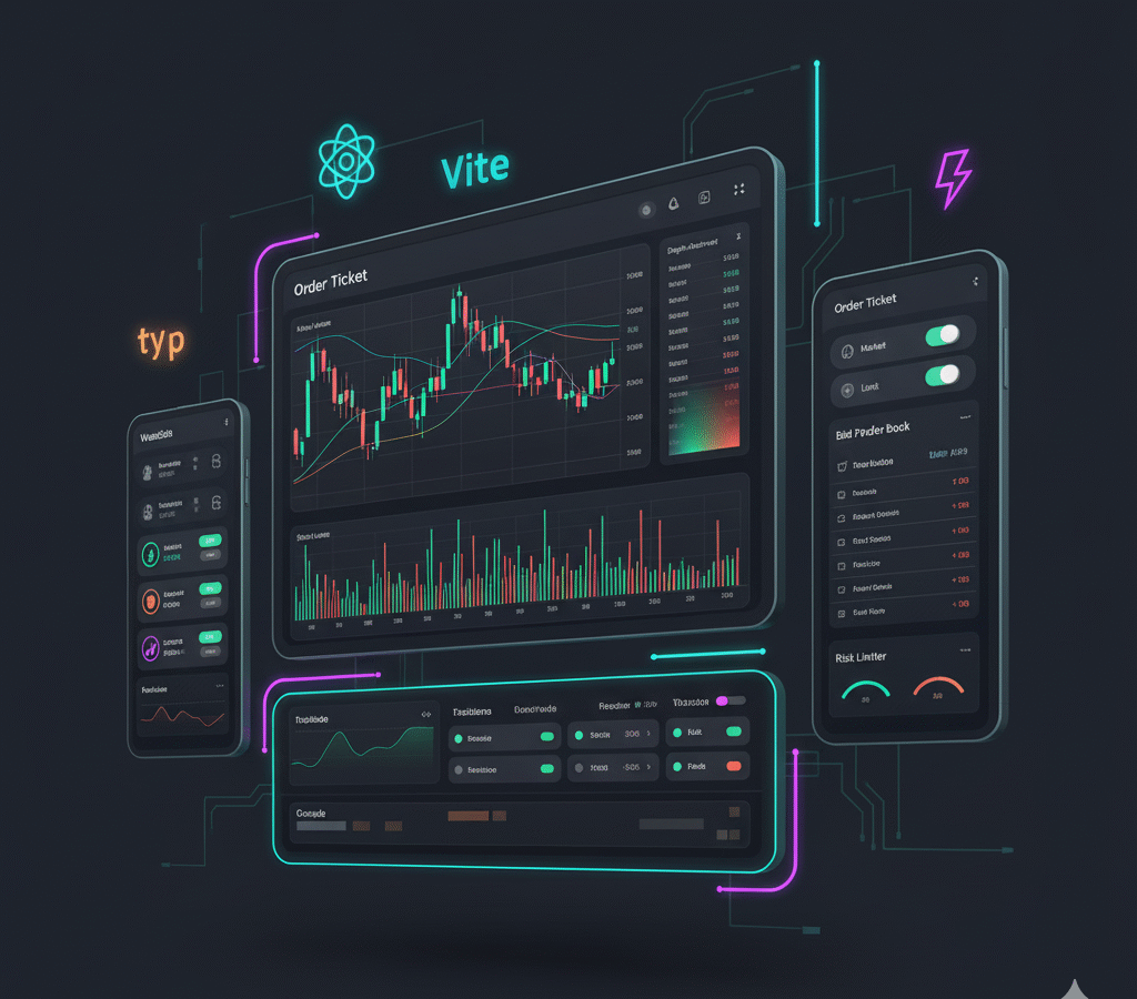 The app typically offer features like real-time price feeds, charts/indicators, watchlists and alerts, order tickets (market/limit/stop), positions/P&L, and an order book. A modular React + TypeScript architecture with shadcn/ui and Vite enables fast loads, code-splitting, and clean adapters for paper or live broker APIs. Secure key handling, role-based access, and execution/error logs support safe operation, while paper trading and backtest views de-risk going live.