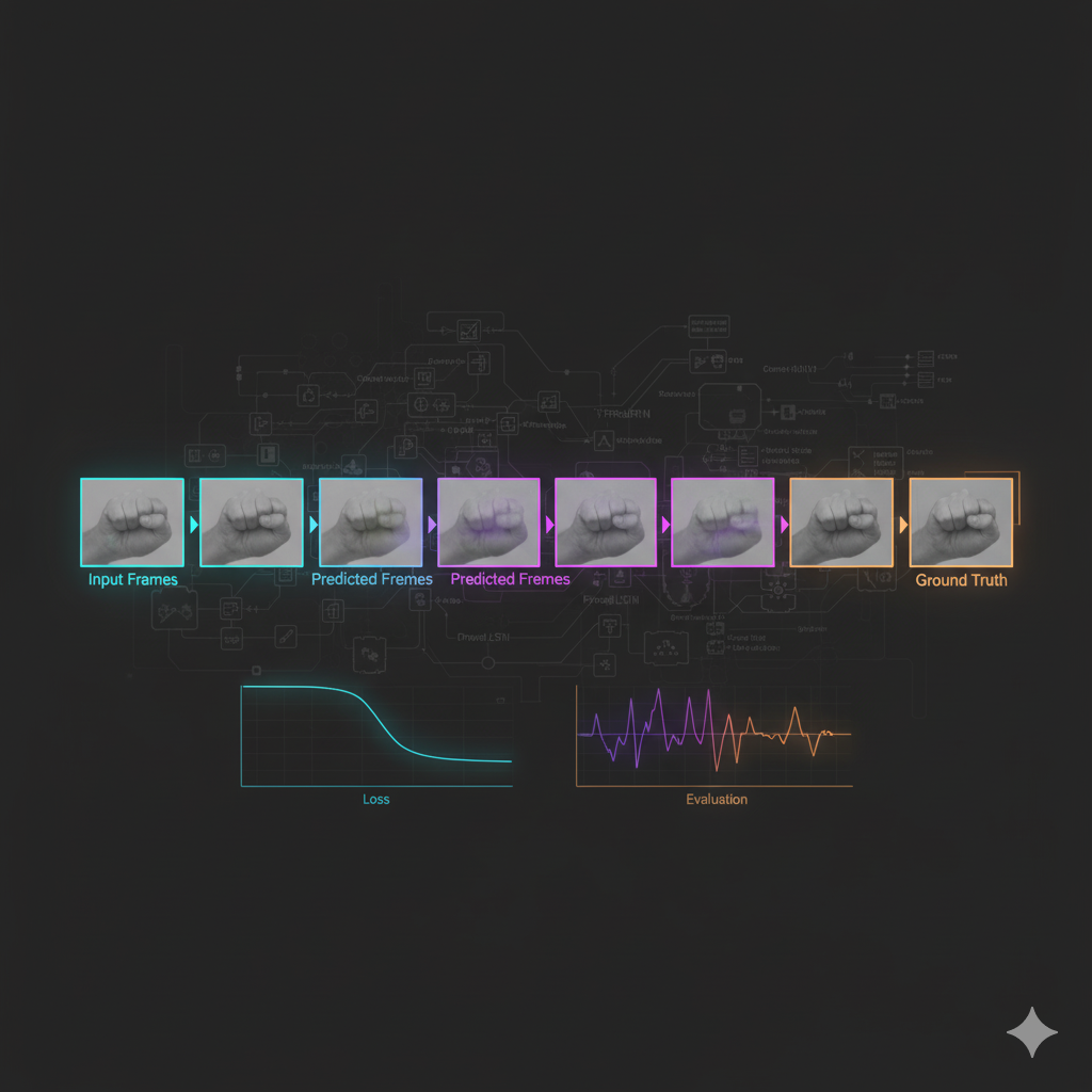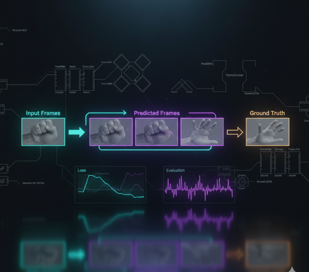 This research pipelines typically include baseline models (PredRNN, ConvLSTM, Transformer), curated sequence datasets, and metrics like MSE/SSIM/PSNR with side-by-side prediction visuals.